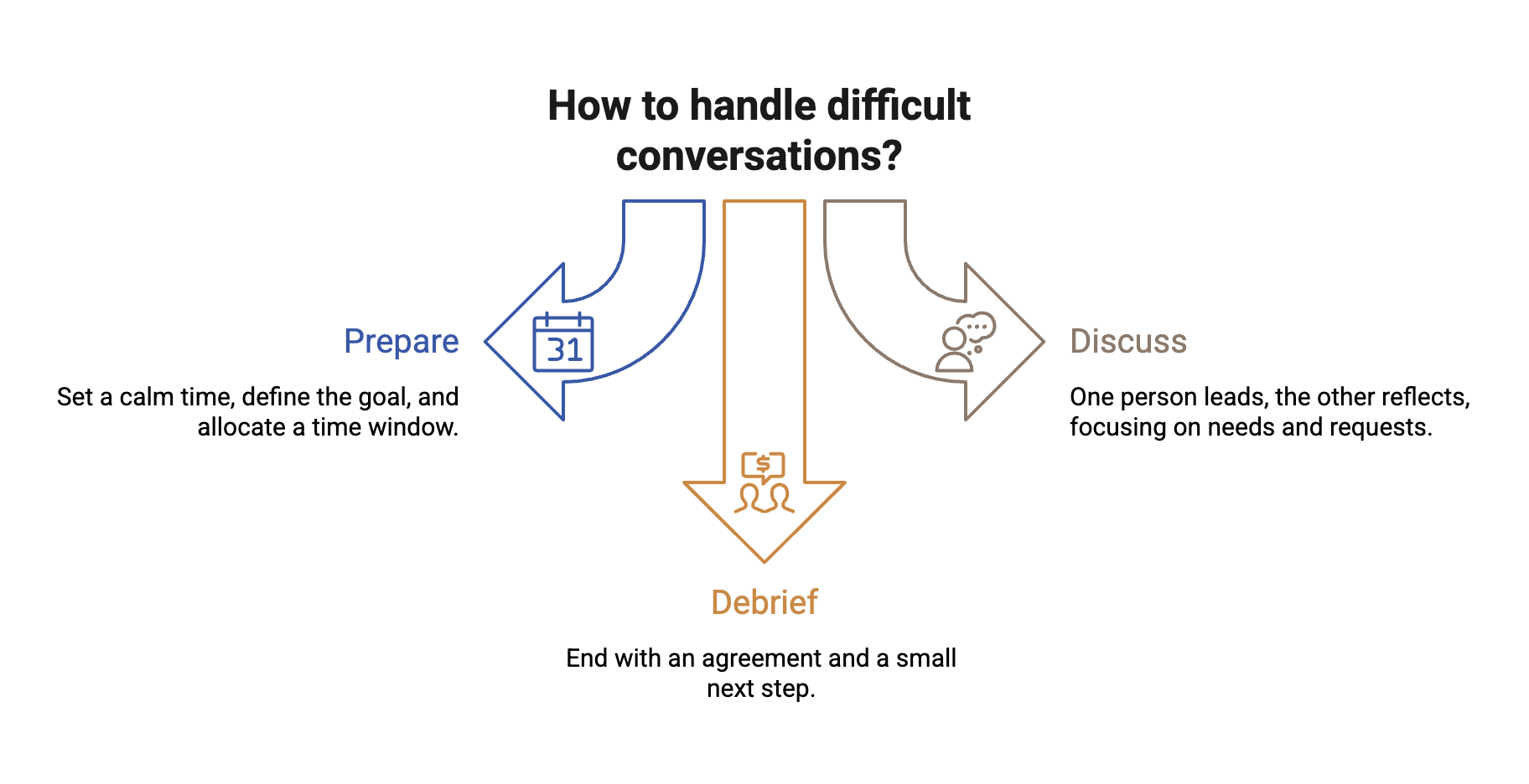 Debrief: End with one agreement and one small next step. If either of you floods, take a time‑out and follow the re‑entry plan below.